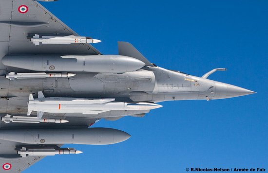 資料圖:陣風(fēng)在機身中線(xiàn)掛點(diǎn)攜帶了一枚ASMP-A巡航導彈