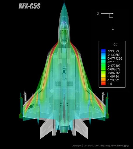 KFX有正常式布局的101方案和鴨式布局的201方案。KFX-101外形上類(lèi)似于F-22,尺寸略小,采用了DSI進(jìn)氣口設計,近乎于一種F-35的雙發(fā)型;另一種則為KFX-201,采用了鴨式布局并列雙發(fā)外傾式雙垂尾設計。飛機的前翼、主翼以及垂直尾翼均為梯形,前緣后掠角稍大而后緣前掠角較小,均互相平行。前翼沒(méi)有上反角,而且與主翼在同一平面上而不是高于主翼。尾翼設計也很普通,直接安裝在機身上的兩個(gè)外傾式垂直尾翼完全起不到對噴口紅外特征的遮擋作用。而且過(guò)于靠前、靠?jì)鹊拇怪蔽惨碓陲w機大迎角飛行時(shí)完全被其機身和主翼的遮蔽。比較特別的是,為了保證對地面雷達的低可探測性,KFX-201的機頭為帶棱角的五邊棱錐。