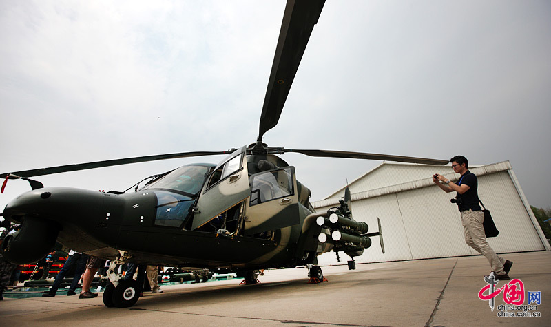 一名記者正在拍攝靜態(tài)展示區的直9-WZ武裝直升機。 攝影:中國網(wǎng) 楊佳