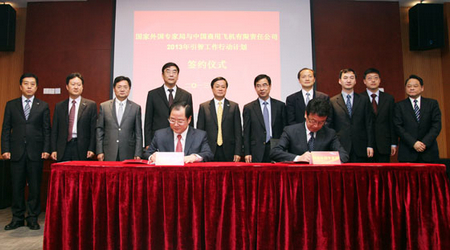 長(cháng)期以來(lái),國家外專(zhuān)局對中國商飛公司的人才引進(jìn)工作高度重視。2009年,雙方簽訂了《引進(jìn)國外智力服務(wù)框架協(xié)議》。2012年,雙方簽訂了《2012年引智工作行動(dòng)計劃》,國家外專(zhuān)局還授予中國商飛公司全國首家“國家引進(jìn)國外智力示范單位”稱(chēng)號。