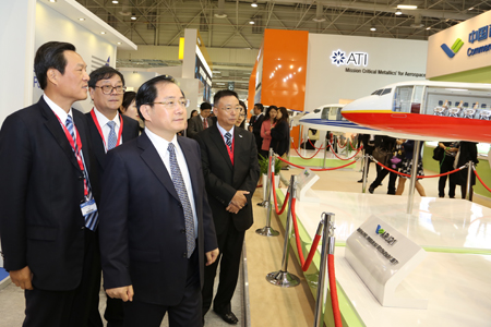 中國經(jīng)濟網(wǎng)航空6月18日訊 2013年6月17日,第五十屆巴黎國際航空航天展覽會(huì )在法國巴黎開(kāi)幕,中國商飛公司攜C919大型客機模型、ARJ21-700飛機模型參加本屆航展,全面展示C919大型客機和ARJ21-700飛機研制進(jìn)展。董事長(cháng)金壯龍率團參加本屆航展、副董事長(cháng)滕一龍、總會(huì )計師田民參加航展相關(guān)活動(dòng)。 航展期間,金壯龍、滕一龍和田民等參觀(guān)了賽峰集團、MOOG公司、中航工業(yè)、愛(ài)勵國際、CFM公司等參展商展臺,并與各公司管理層就加強合作進(jìn)行了深入的會(huì )談。