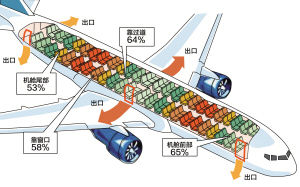 英國民航局委托、由格林威治大學(xué)實(shí)施的研究顯示,飛機上逃生可能性最大的座位是對著(zhù)緊急出口的那排座位和緊急出口前面及后面的一排座位。最危險的座位是距離緊急出口6排和更遠的座位。該研究表示:坐在飛機前面的乘客,從火災中安全逃生的可能性是65%,而坐在飛機后面的乘客逃生的可能性?xún)H為53%。坐在過(guò)道里的乘客從火災中安全逃生的可能性是64%,而其他乘客在這種情況下安全逃生的可能性?xún)H為58%。