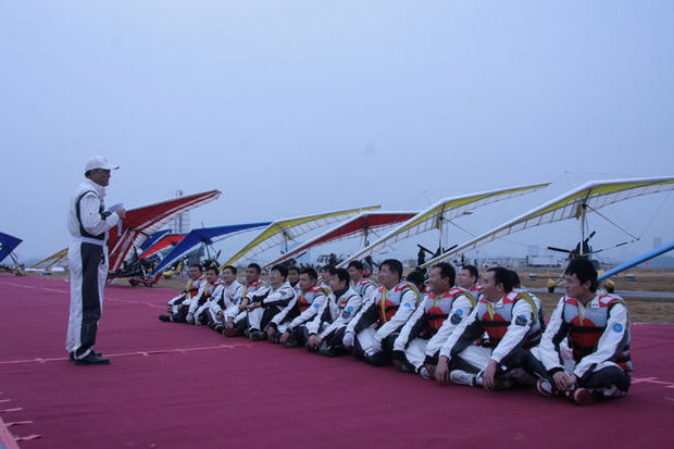 動(dòng)力懸掛滑翔機運動(dòng)員在認真傾聽(tīng)資深教練訓示