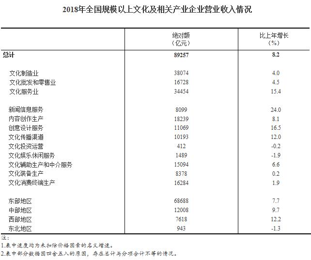 經(jīng)濟日報-中國經(jīng)濟網(wǎng)北京1月31日訊 今天,國家統計局公布了2018年規模以上文化及相關(guān)產(chǎn)業(yè)生產(chǎn)經(jīng)營(yíng)季度報告。報告顯示,據對全國規模以上文化及相關(guān)產(chǎn)業(yè)6.0萬(wàn)家企業(yè)調查,2018年,上述企業(yè)實(shí)現營(yíng)業(yè)收入89257億元,比上年增長(cháng)8.2% (按可比口徑計算。為名義增長(cháng),未扣除價(jià)格因素。按照《文化及相關(guān)產(chǎn)業(yè)分類(lèi)(2018)》新標準測算,上述企業(yè)2017年實(shí)現的營(yíng)業(yè)收入為82456億元。)。