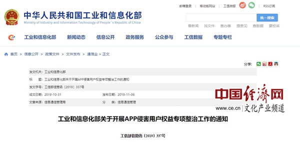 經(jīng)濟日報-中國經(jīng)濟網(wǎng)北京11月26日訊 日前,工業(yè)和信息化部發(fā)布《關(guān)于開(kāi)展APP侵害用戶(hù)權益專(zhuān)項整治工作》的通知,《通知》稱(chēng),鑒于當前APP違規收集個(gè)人信息、過(guò)度索權、頻繁騷擾、侵害用戶(hù)權益等問(wèn)題突出將開(kāi)展專(zhuān)項整治工作,專(zhuān)項整治工作時(shí)間將一直持續至2019年12月20日。