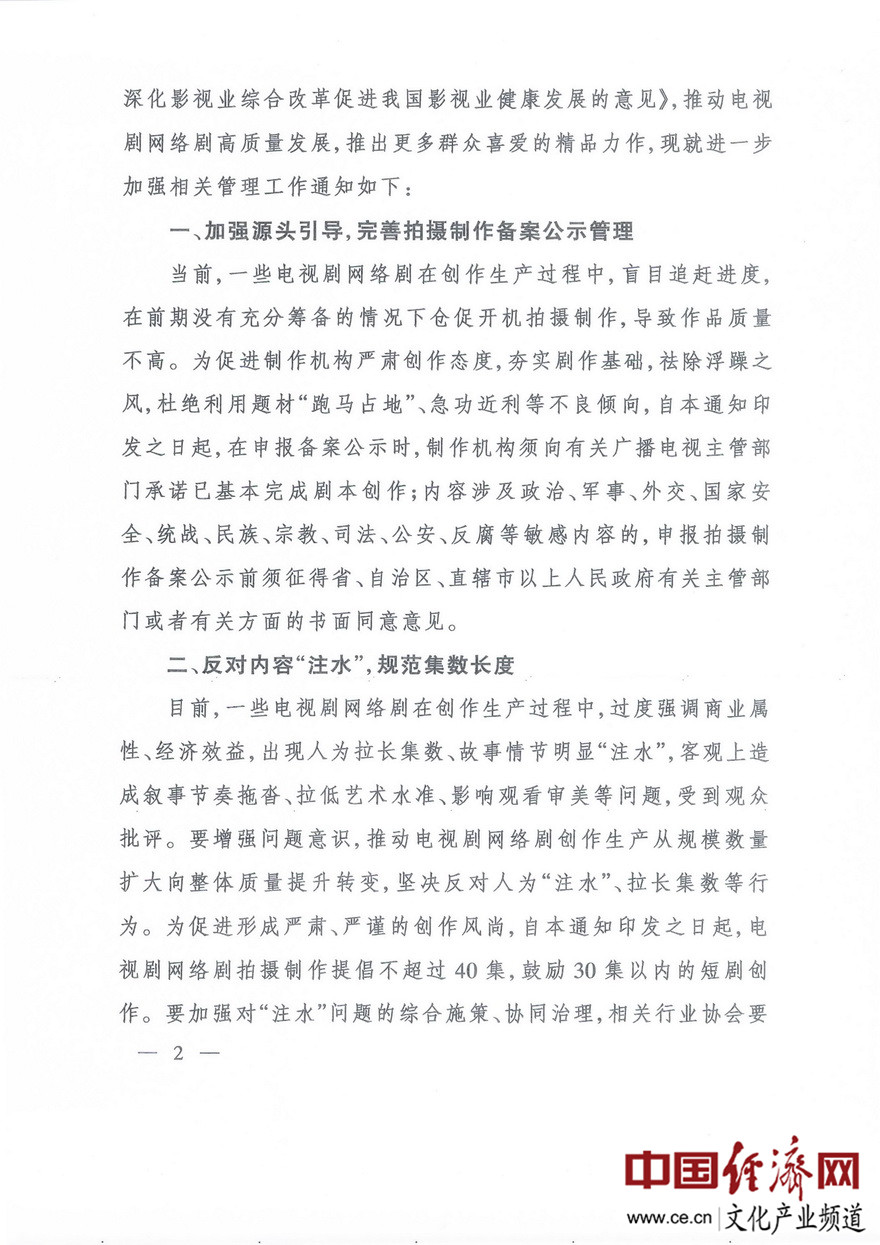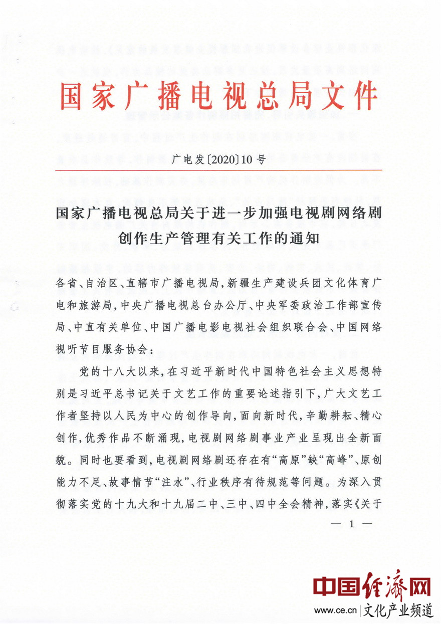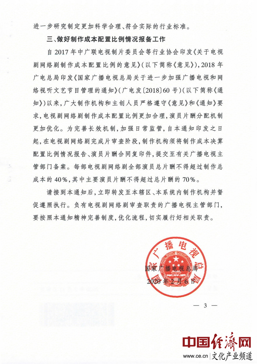 經(jīng)濟日報-中國經(jīng)濟網(wǎng)北京2月20日訊 近日,國家廣播電視總局下發(fā)了《進(jìn)一步加強電視劇網(wǎng)絡(luò )劇創(chuàng )作生產(chǎn)管理有關(guān)工作的通知》(廣電發(fā)﹝2020﹞10號)。據經(jīng)濟日報-中國經(jīng)濟網(wǎng)文化產(chǎn)業(yè)頻道(微信號:cewenhua)了解,該《通知》要求:一是加強源頭引導,在申報備案公示時(shí),制作機構須向省局承諾已基本完成劇本創(chuàng )作;二是反對內容“注水”,電視劇網(wǎng)絡(luò )劇拍攝制作提倡不超過(guò)40集,鼓勵30集以?xún)榷虅?chuàng )作;三是做好制作成本配置比例情況報備工作。在電視劇網(wǎng)絡(luò )劇完成片審查階段,制作機構須將制作成本決算配置比例情況報告、演員片酬合同復印件,提交至省局備案。每部電視劇網(wǎng)絡(luò )劇全部演員總片酬不得超過(guò)制作總成本的40%,其中主要演員片酬不得超過(guò)總片酬的70%。>>>更多政策可查看中國經(jīng)濟網(wǎng)“中國文化產(chǎn)業(yè)政策庫”