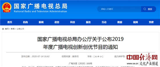 經(jīng)濟日報-中國經(jīng)濟網(wǎng)北京7月15日訊 7月14日,國家廣播電視總局公布了2019年度廣播電視創(chuàng )新創(chuàng )優(yōu)節目。