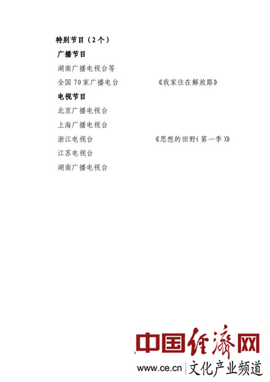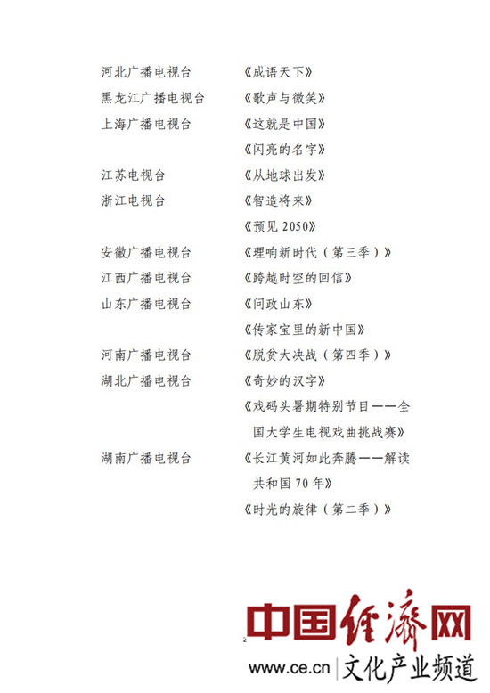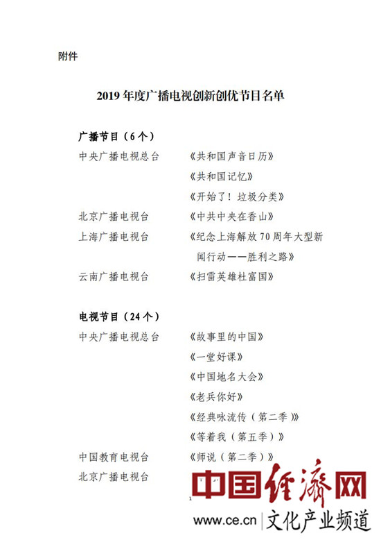 經(jīng)評議,國家廣播電視總局確定中央廣播電視總臺《共和國聲音日歷》、北京廣播電視臺《中共中央在香山》等6個(gè)廣播節目,中央廣播電視總臺《故事里的中國》《中國地名大會(huì )》、上海廣播電視臺《這就是中國》、江蘇電視臺《從地球出發(fā)》等24個(gè)電視節目為“2019年度廣播電視創(chuàng )新創(chuàng )優(yōu)節目”,每個(gè)節目給予5萬(wàn)元的資金扶持;確定《我家住在解放路》《思想的田野》2個(gè)集體創(chuàng )作的節目為“2019年度廣播電視創(chuàng )新創(chuàng )優(yōu)特別節目”。