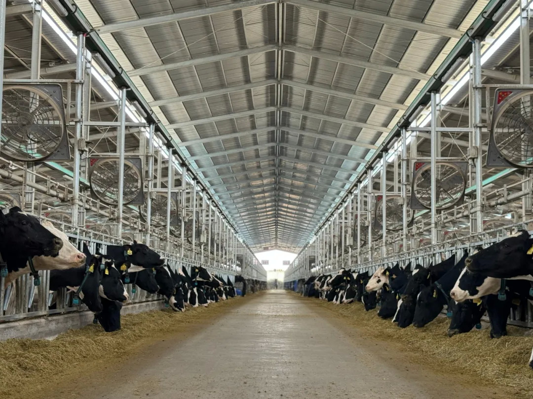 走進(jìn)現代牧業(yè)唐山牧場(chǎng)奶牛養殖區,現代化的牛舍錯落分布。每一座牛舍都配備“硬核”裝備:智能精準飼喂TMR系統、自感應風(fēng)機、精準噴淋裝置、奶牛情期預報系統以及糞污智能清理系統等智能設備一應俱全。