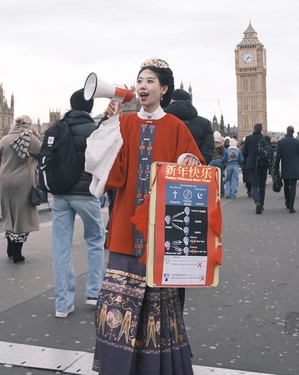 江西女生曹夢(mèng)竹畢業(yè)于愛(ài)丁堡大學(xué),在碩士入學(xué)前,她正在度過(guò)自己的間隔年,在社交媒體上分享著(zhù)留學(xué)生活的點(diǎn)滴日常。得知申遺成功的消息,她從攝影師朋友那里借來(lái)一身紅色的明制漢服,帶著(zhù)擴音器、媽媽編織的中國結和春節文化的宣傳板,來(lái)到人山人海的倫敦眼、大本鐘下,“來(lái)自世界各地的朋友都會(huì )在那兒打卡”。