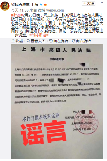 21日上午,上海市公安局發(fā)微博回應:經(jīng)調查,該信息不屬實(shí),網(wǎng)傳《扣押通知書(shū)》系偽造。目前,公安機關(guān)正在開(kāi)展進(jìn)一步調查。