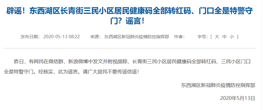 據武漢市東西湖區人民政府官網(wǎng)5月13日消息,經(jīng)核實(shí),網(wǎng)傳“鐘南山已來(lái)東西湖區三民小區,武漢東西湖區三民小區又增加13例確診病人?!?“長(cháng)青街三民小區居民健康碼全部轉紅碼、三民小區門(mén)口全是特警守門(mén)”均系謠言。