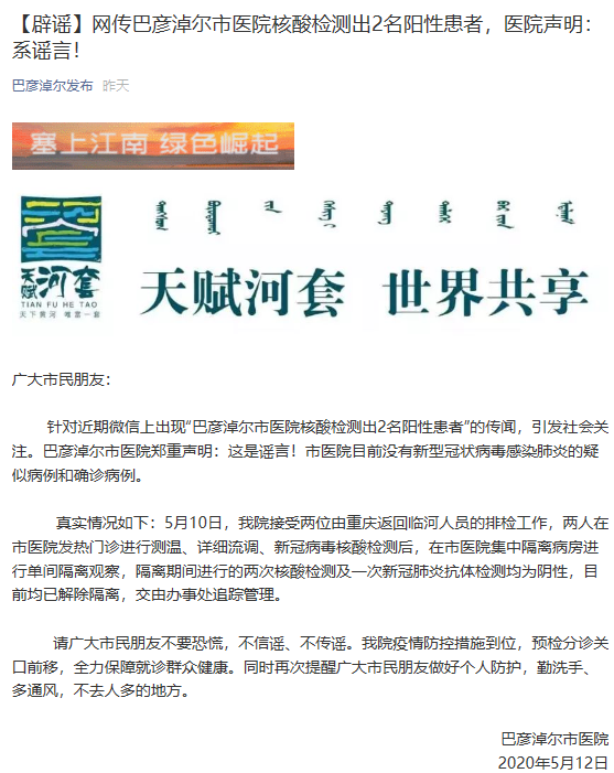 謠言粉碎機五:內蒙古巴彥淖爾市醫院核酸檢測出2名陽(yáng)性患者?謠言!