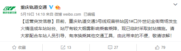 近日,有消息稱(chēng)因出現疑似病例,重慶軌道交通3號線(xiàn)觀(guān)音橋站被封。對此,5月19日14時(shí),重慶市軌道交通(集團)有限公司@重慶軌道交通回應稱(chēng),目前,重慶軌道交通3號線(xiàn)觀(guān)音橋站因1#口外世紀金街商場(chǎng)發(fā)生火情造成車(chē)站站臺、站廳有較大煙霧影響乘客乘降,現已臨時(shí)采取封站措施。????