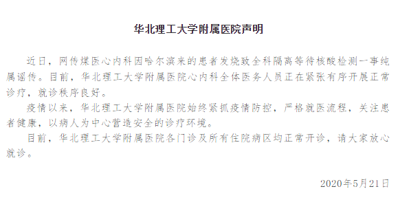 5月21日,華北理工大學(xué)附屬醫院發(fā)布聲明稱(chēng),近日,網(wǎng)傳“煤醫(現為華北理工大學(xué)附屬醫院)心內科因哈爾濱來(lái)的患者發(fā)燒致全科隔離等待核酸檢測”一事純屬謠傳。目前,華北理工大學(xué)附屬醫院心內科全體醫務(wù)人員正在緊張有序開(kāi)展正常診療,就診秩序良好。