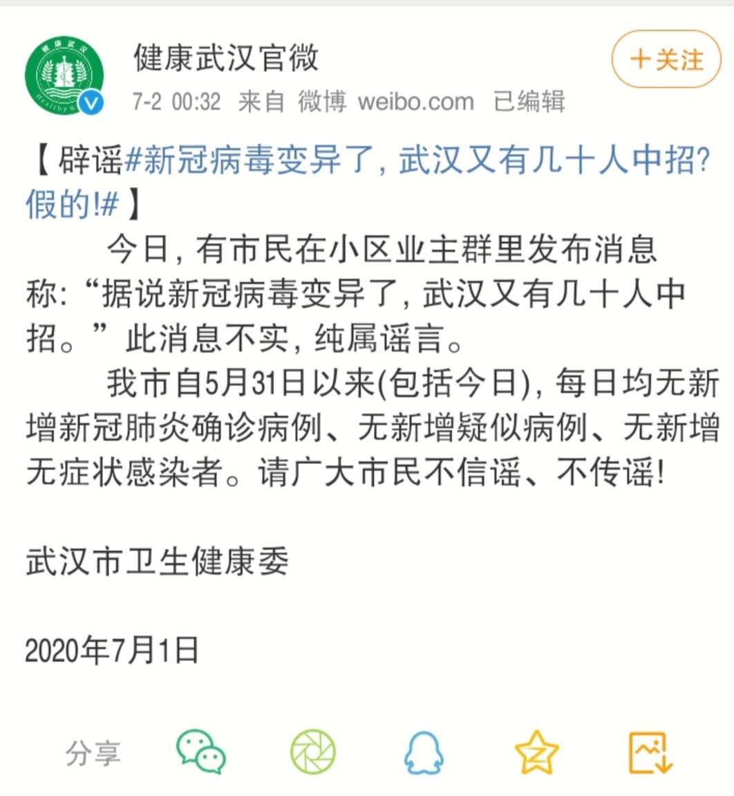 7月1日,武漢市衛生健康委辟謠稱(chēng),此消息不實(shí),純屬謠言。武漢市自5月31日以來(lái),每日均無(wú)新增新冠肺炎確診病例、無(wú)新增疑似病例、無(wú)新增無(wú)癥狀感染者。請廣大市民不信謠、不傳謠!