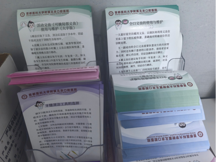 記者走進(jìn)北京口腔醫院門(mén)診樓,綠色的“老年咨詢(xún)臺”標示映入眼簾。老年咨詢(xún)臺正前方走20米,左手邊便是老年口腔病科。順著(zhù)黃色地標徑直走約30米,便到達分診臺。上午的分診臺前,是患者最多的時(shí)候,詢(xún)問(wèn)聲和指引聲交織,忙而有序。分診臺一角的老花鏡和大字版宣教彩頁(yè)引人矚目。護士告訴記者,這是為老年患者特意準備的?!翱剖医ǖ臅r(shí)間長(cháng),我們也準備搬新院了,雖然地方有點(diǎn)局促,但該有的硬件都有?!?/p>