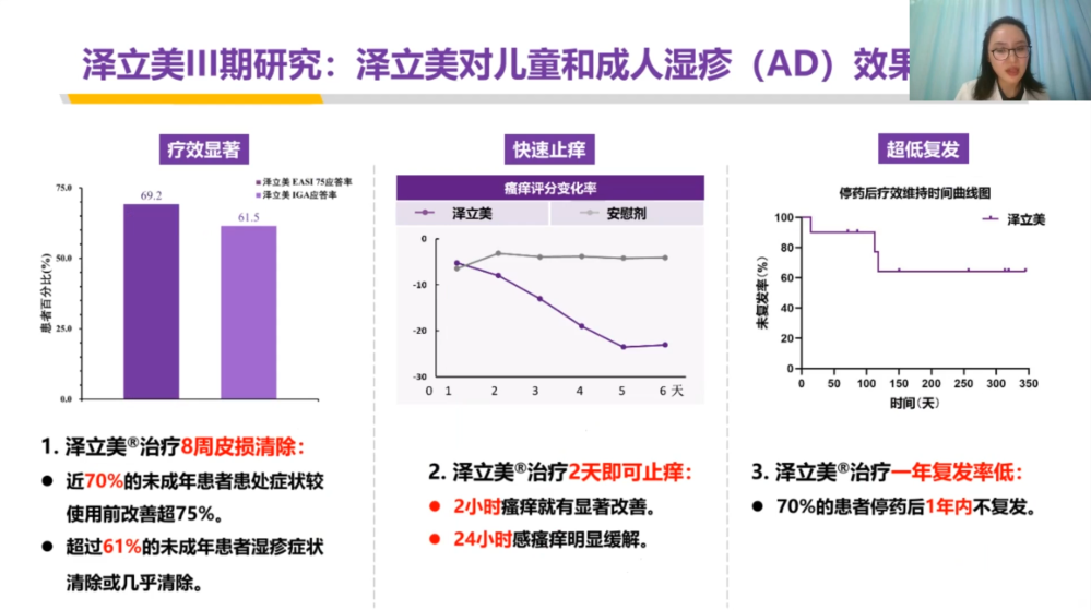 趙琰教授還分享了澤立美重要臨床數據:"在為期8周的III期臨床試驗中,澤立美組61.5%的患者實(shí)現皮損完全清除,瘙癢改善最快僅需2小時(shí)。更可喜的是,停藥1年后仍有70%患者維持緩解狀態(tài)。"相比美國市場(chǎng)1400美元/支的售價(jià),該藥國內定價(jià)僅360元,大大減輕患者經(jīng)濟負擔。