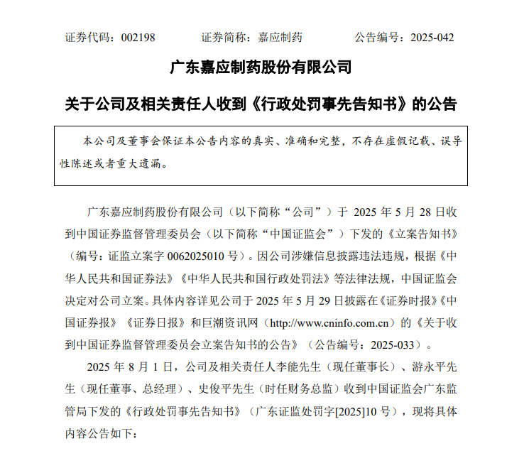 中國證監會(huì )廣東監管局認為,嘉應制藥的上述行為涉嫌違反了《中華人民共和國證券法》(以下簡(jiǎn)稱(chēng)《證券法》)第七十八條第一款、第八十條第一款和第二款第三項的規定,構成《證券法》第一百九十七條第一款所述違法行為。嘉應制藥涉案期間有關(guān)董事、高級管理人員涉嫌違反了《證券法》第八十二條第三款的規定,構成《證券法》第一百九十七條第一款所述“直接負責的主管人員和其他直接責任人員”。