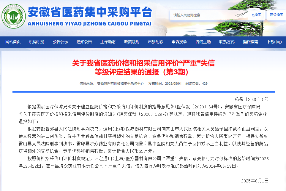 通報顯示,根據安徽省黟縣人民法院刑事判決書(shū),通用(上海)醫療器材有限公司向黃山市人民醫院相關(guān)人員給予回扣或不正當利益,以使其經(jīng)營(yíng)的進(jìn)口創(chuàng )傷類(lèi)、脊柱類(lèi)骨科高值耗材獲得額外的交易機會(huì )、競爭優(yōu)勢和銷(xiāo)售數量,累計折合人民幣54萬(wàn)元;按照價(jià)格招采信用評價(jià)制度規定,評定通用(上海)醫療器材有限公司“嚴重”失信,該失信行為時(shí)效標準的起始時(shí)間為2023年12月22日。