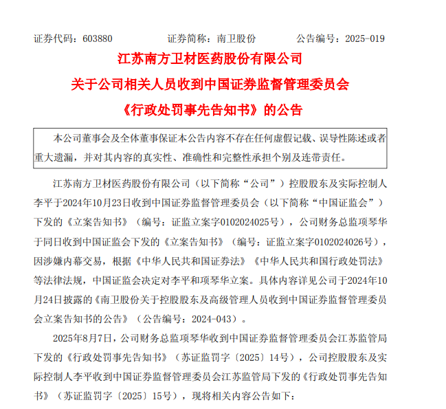 中國經(jīng)濟網(wǎng)北京8月8日訊(記者 郭文培)8月8日,江蘇南方衛材醫藥股份有限公司(以下簡(jiǎn)稱(chēng)南衛股份)披露公告,因內幕交易,公司控股股東及實(shí)際控制人李平、公司財務(wù)總監項琴華收到了中國證券監督管理委員會(huì )江蘇監管局下發(fā)的《行政處罰事先告知書(shū)》,李平擬被罰沒(méi)逾4710萬(wàn)元,項琴華擬被罰沒(méi)逾160萬(wàn)元。