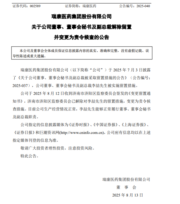 中國經(jīng)濟網(wǎng)北京815日訊(記者 郭文培)813日,瑞康醫藥集團股份有限公司(以下簡(jiǎn)稱(chēng)瑞康醫藥)披露公告稱(chēng),公司收到濟南市濟陽(yáng)區監察委員會(huì )簽發(fā)的《變更留置通知書(shū)》,濟南市濟陽(yáng)區監察委員會(huì )已解除對公司董事、董事會(huì )秘書(shū)及副總裁李喆的留置措施,變更為責令候查措施。