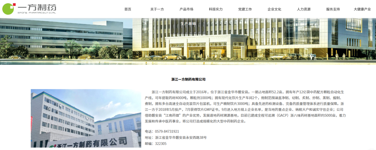 一方制藥官網(wǎng)介紹,浙江一方制藥有限公司成立于2016年,位于浙江省金華市磐安縣,公司于20185月投產(chǎn),7月獲得飲片GMP證書(shū),9月進(jìn)入地方規上企業(yè)名單,是當地的重點(diǎn)企業(yè)、納稅大戶(hù)和誠實(shí)守信企業(yè)。天眼查顯示,國藥集團香港有限公司為浙江一方制藥有限公司實(shí)控人。