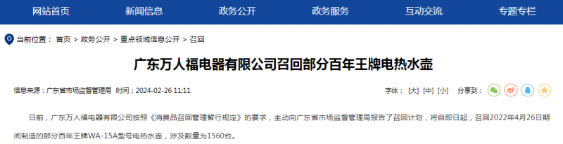 日前,廣東萬(wàn)人福電器有限公司按照《消費品召回管理暫行規定》的要求,主動(dòng)向廣東省市場(chǎng)監督管理局報告了召回計劃,將自即日起,召回2022年4月26日期間制造的部分百年王牌WA-15A型號電熱水壺,涉及數量為1560臺。