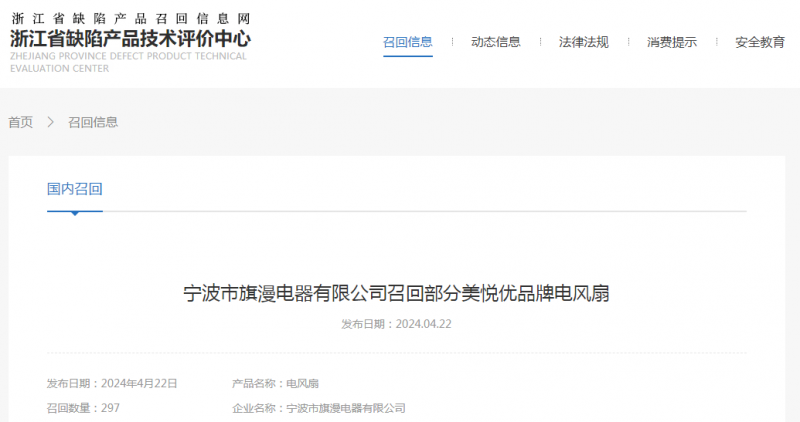 目前,寧波市旗漫電器有限公司受缺陷調查影響按照《消費品召回管理暫行規定》的要求,主動(dòng)向浙江省市場(chǎng)監督管理局和寧波市市場(chǎng)監督管理局報告了召回計劃,將自即日起,召回2023年5月22日至25日期間制造的部分美悅優(yōu)品牌型號QM-LD001電風(fēng)扇(循環(huán)扇),涉及數量297臺。
