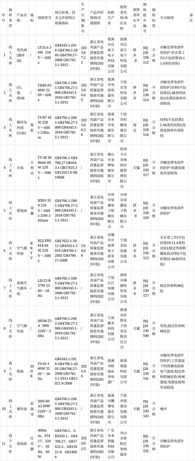 本次抽查了40批次電風(fēng)扇產(chǎn)品,其中11批次產(chǎn)品不合格。不合格項目為對觸及帶電部件的防護、非正常工作、結構、電源連接和外部軟線(xiàn)、發(fā)熱、穩定性和機械危險、工作溫度下的泄漏電流和電氣強度、機械強度、噪聲。