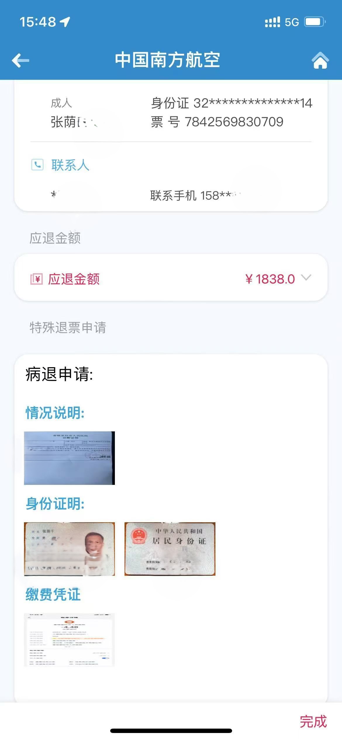 通過(guò)南航APP提交病退材料,只退回1838元。 消費者張先生供圖