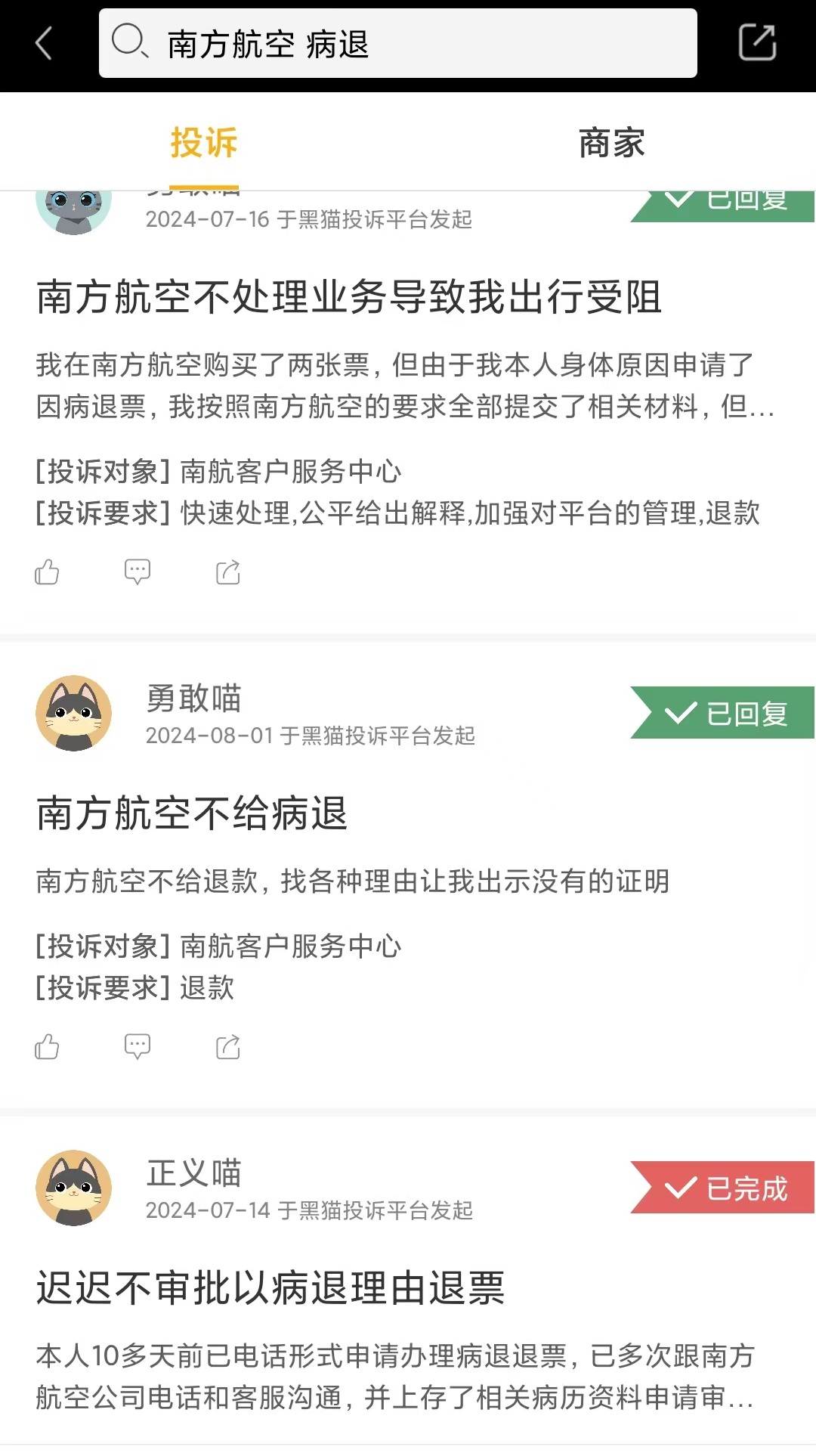 投訴平臺上有關(guān)南航病退的投訴。 資料圖片