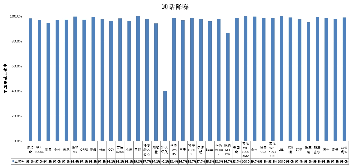 本次比較的36款無(wú)線(xiàn)耳機中,通話(huà)降噪能力出色的是索尼(WI-1000XM2)和JBL哈曼,接聽(tīng)記錄錯誤率0%,通話(huà)降噪效果好,完全沒(méi)有受到噪聲影響,接聽(tīng)語(yǔ)音非常清晰;2款無(wú)線(xiàn)耳機降噪能力比較弱,接聽(tīng)記錄錯誤率超過(guò)10%,分別為科大訊飛和酷狗(酷狗M3 Pro)耳機,通話(huà)降噪欠佳的耳機在噪聲環(huán)境下,如地鐵、火車(chē)站、餐廳等地點(diǎn)通話(huà),會(huì )導致對方收音不清晰,無(wú)法正常交流。