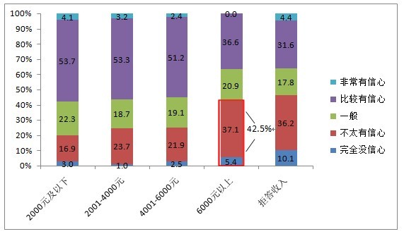 隨著(zhù)人們收入水平的提高,大家對于食品安全越發(fā)沒(méi)有信心,數據顯示,除了拒絕透露收入水平的人群外,6000元以上的高收入人群對現狀沒(méi)有信心的比例最高,超四成。