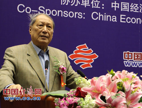 中國科學(xué)院預測科學(xué)研究中心1月26日(周五)在北京中科院數學(xué)與系統科學(xué)研究院舉辦“2013年中國經(jīng)濟預測發(fā)布與研討會(huì )”。圖為中國科學(xué)院預測科學(xué)研究中心學(xué)術(shù)委員會(huì )主任 第七、八屆全國人大副委員長(cháng)成思危致辭。中國經(jīng)濟網(wǎng)楊瀟/攝影