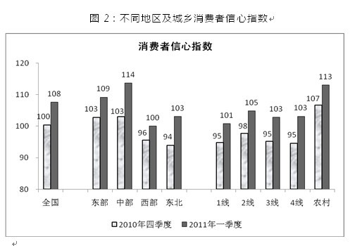 2011年一季度中國消費者信心指數為108,比2010年四季度大幅上升8點(diǎn),接近近兩年高點(diǎn)。消費者對當前經(jīng)濟形勢的滿(mǎn)意度和對未來(lái)經(jīng)濟走勢的預期樂(lè )觀(guān)度均明顯上升,持樂(lè )觀(guān)態(tài)度的消費者比重均接近兩年內的最高點(diǎn)。